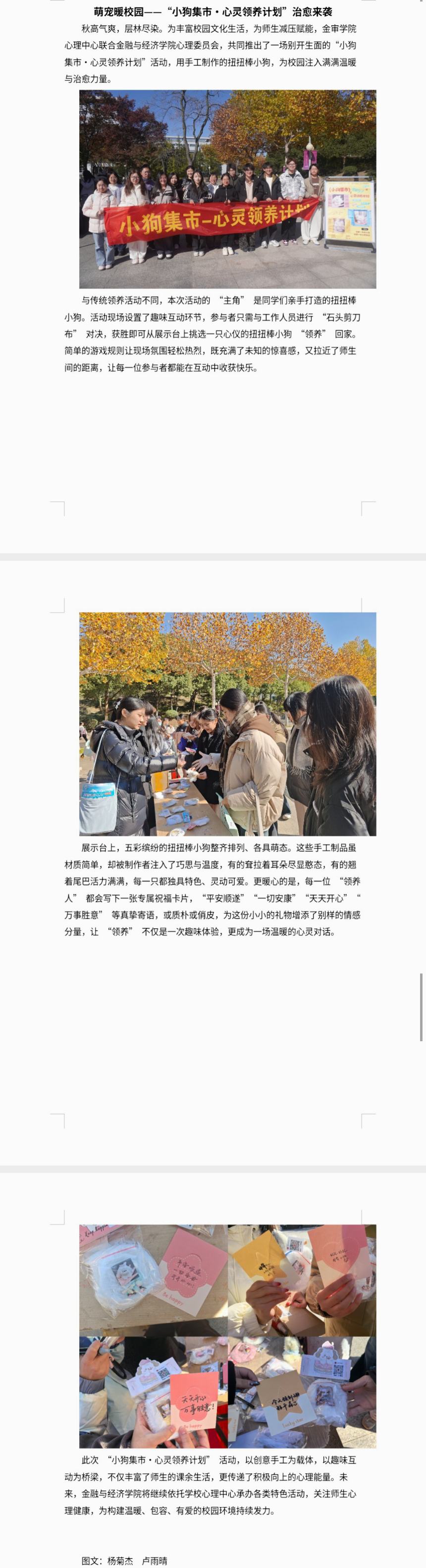 秋高氣爽,層林盡染。為豐富校園文化生活,為師生減壓賦能,金審學院心理中心聯合金融與經濟學院心理委員會,共同推出了一場別開生面的“小狗集市•心靈領養計劃”活動,用手工制作的扭扭棒小狗,為校園注入滿滿溫暖與治愈力量。