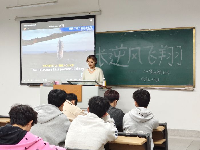班會伊始,心理委員以“蝴蝶破繭”的勵志小故事導入,引發(fā)學生對挫折意義的深度思考,隨后詳細介紹了班會主題、流程及預(yù)期目標,迅速調(diào)動起現(xiàn)場氛圍。在主題分享環(huán)節(jié),心理委員通過PPT展示了學業(yè)挫折、人際矛盾、生活變故等常見案例,系統(tǒng)講解了心理韌性的概念、重要性,并分享了積極自我暗示、合理情緒宣泄等實用提升方法,期間穿插互動提問,引導學生主動思考“哪些品質(zhì)有助于應(yīng)對挫折”,現(xiàn)場響應(yīng)熱烈。