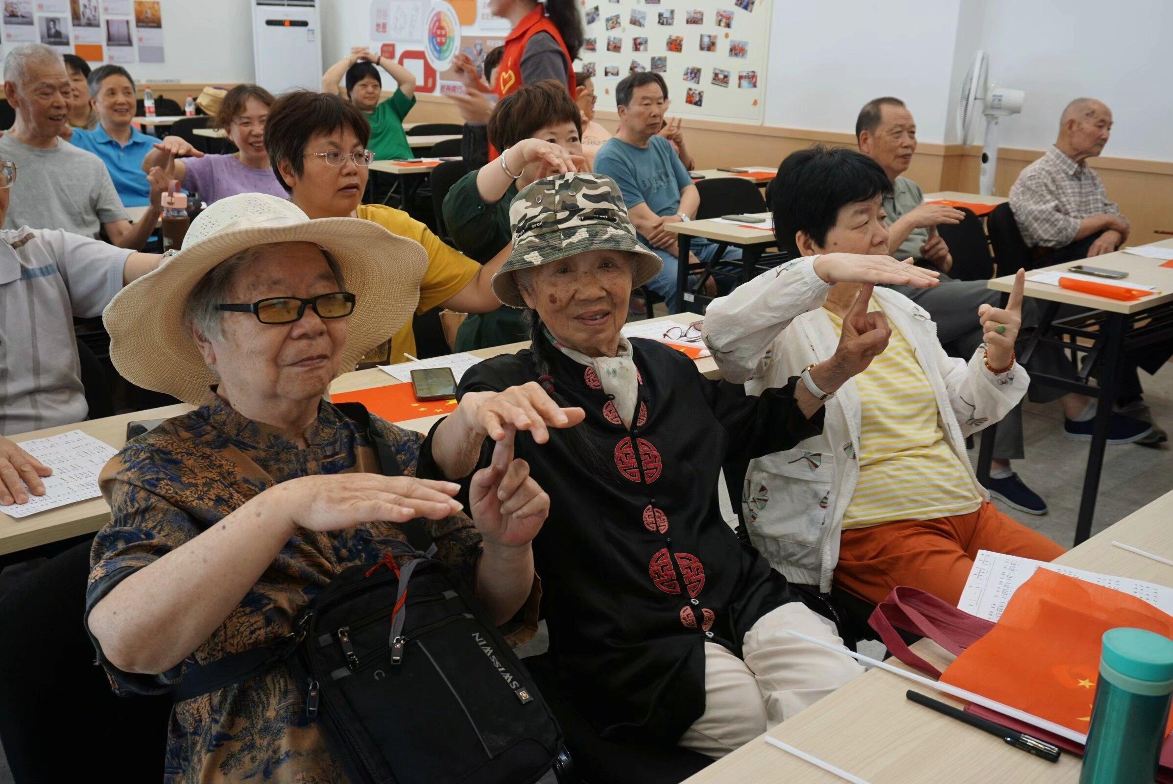 圖為老人在游戲互動時的快樂模樣。 李文佳攝