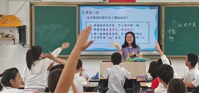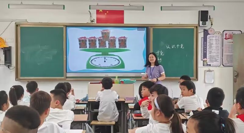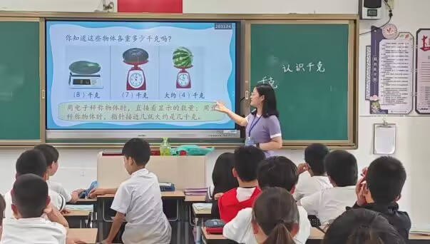 2023年9月27日,我開始了在大浦中心小學(xué)三 (5)班第一次新授課:《認(rèn)識(shí)千克》。因?yàn)樘崆昂椭笇?dǎo)老師打聽過(guò)學(xué)校沒(méi)有盤秤,所以課本上稱書包,稱數(shù)學(xué)書這樣的環(huán)節(jié)難以進(jìn)行。課前我準(zhǔn)備了1千克紅棗,1青梅綠茶,一袋1千克大米以及一袋薯片,我還將宿舍的電子體重計(jì)帶入課堂,盡可能的讓同學(xué)們能對(duì)千克有更直觀的理解。