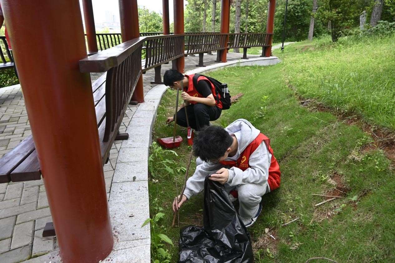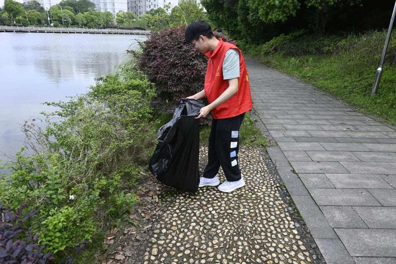 圖為志愿者收集著清潔來的垃圾,將其全部帶走讓松園一塵不染。