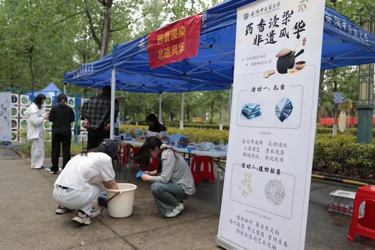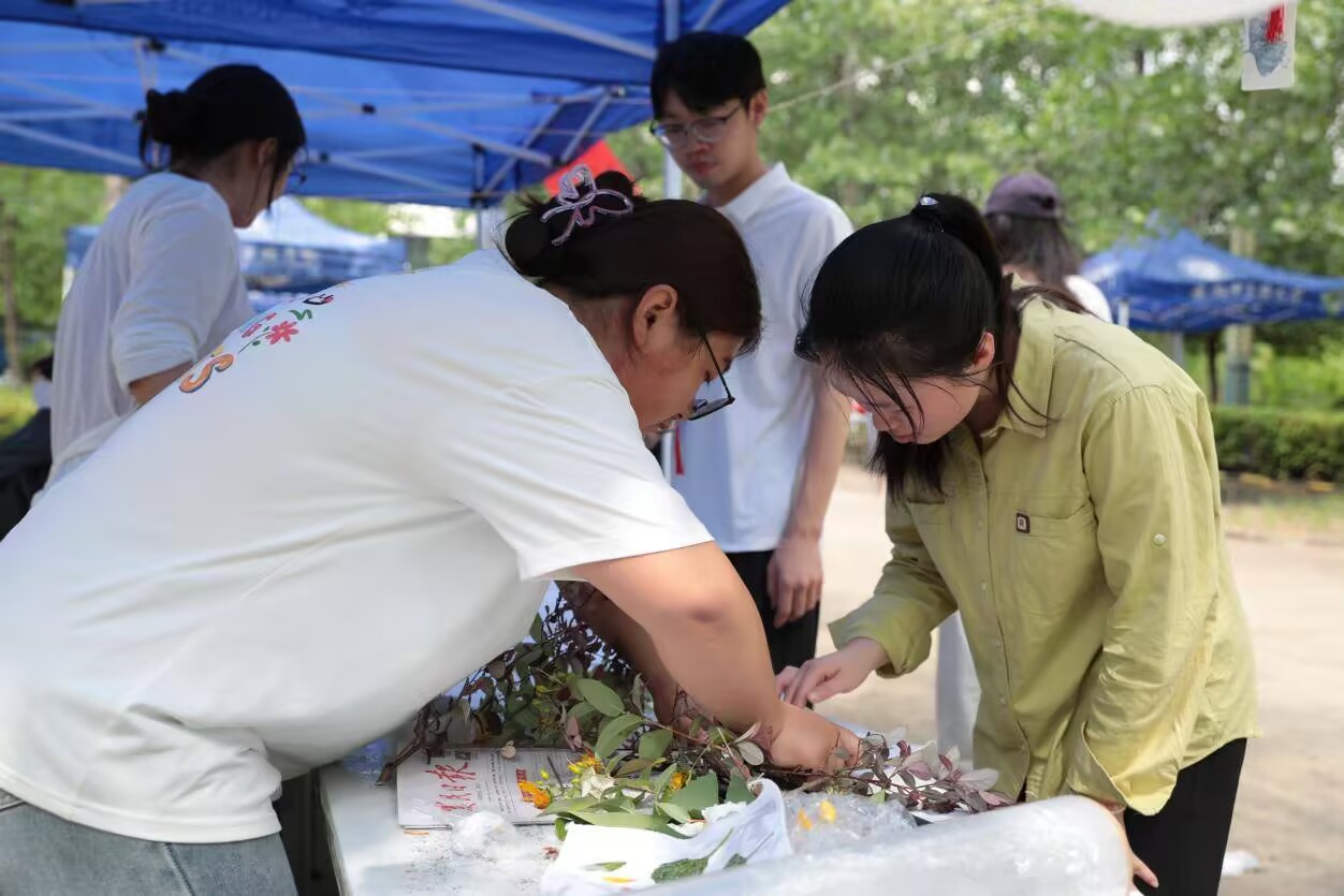 中醫(yī)藥與非遺文化的結(jié)合是本屆文化節(jié)的亮點之一。師生以中藥材為染料,在扇面上繪制出古法漆扇,將傳統(tǒng)技藝與中醫(yī)藥元素巧妙融合;“植物拓染”區(qū)則通過敲擊植物葉片,將草藥紋理永久定格于布匹之上,展現(xiàn)自然與人文的對話。此外,干花書簽、香薰蠟片制作等活動同步開展,讓參與者在實踐中領(lǐng)悟中醫(yī)藥文化的深厚底蘊和獨特價值。