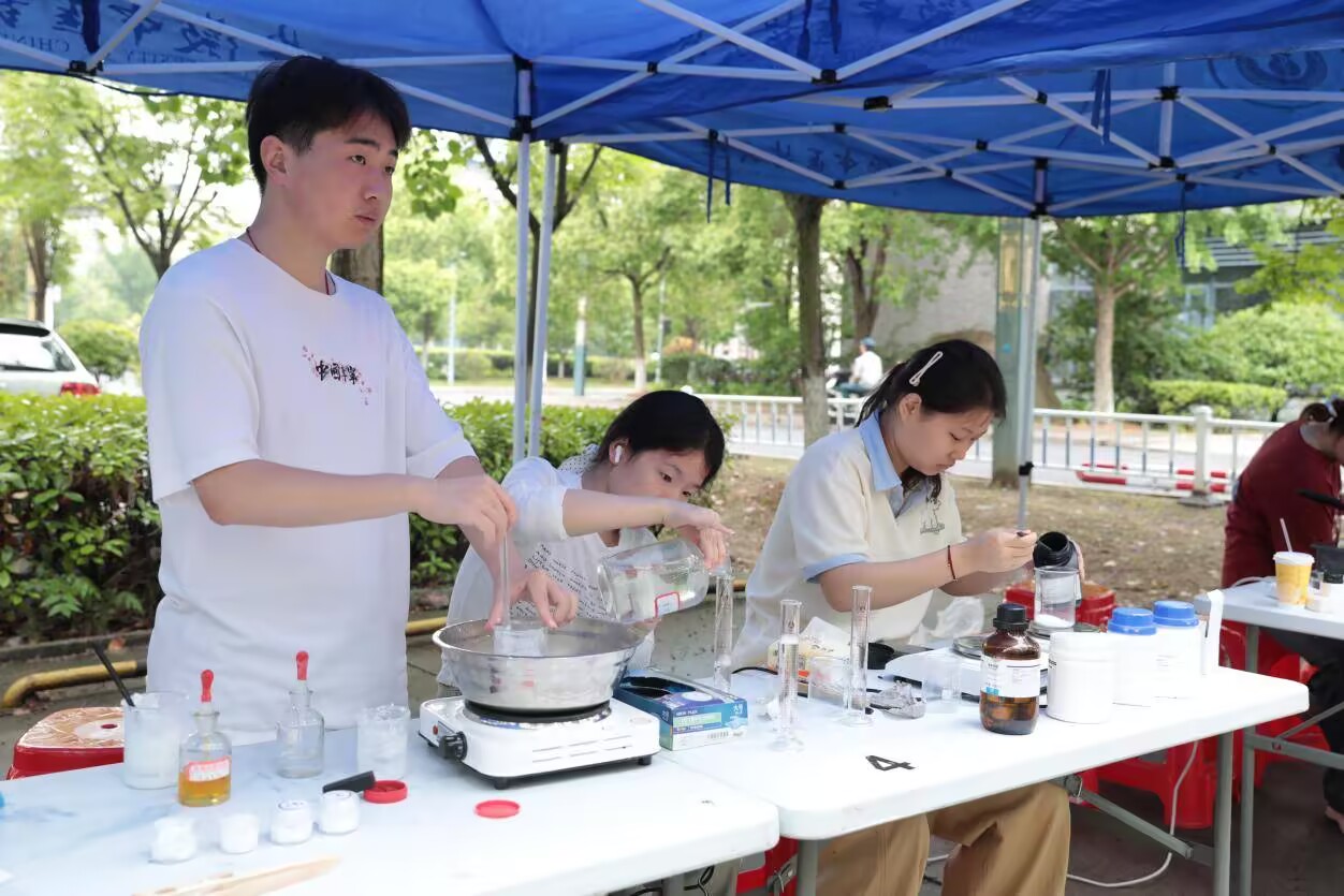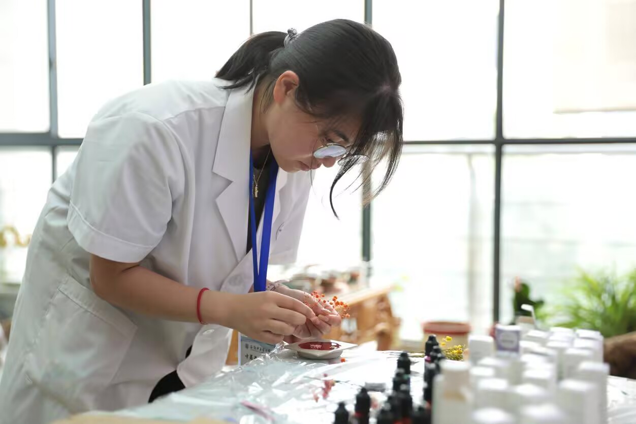 百草飄香浸校園,多維聯(lián)動打造文化盛宴文化節(jié)當(dāng)天,活動現(xiàn)場設(shè)置了豐富多樣的互動體驗區(qū),涵蓋中藥炮制、雪花膏痱子粉制作、中藥飾品DIY、漆扇制作、植物拓染等20余項實踐項目。在炮制區(qū),師生親手體驗中藥炮制工藝,現(xiàn)場展示麩炒山楂、王不留行等中藥飲片的傳統(tǒng)炮制工藝,學(xué)生們通過觀察火候掌控、輔料配伍,深刻體會“制雖繁、不惜工”的匠心;在 “妙手生藥”“粉面玉妝”區(qū),學(xué)生們利用現(xiàn)代技術(shù)改良傳統(tǒng)配方,制作出兼具實用性與藥用價值的雪花膏和痱子粉,實現(xiàn)了古典智慧與現(xiàn)代科技的跨界融合。