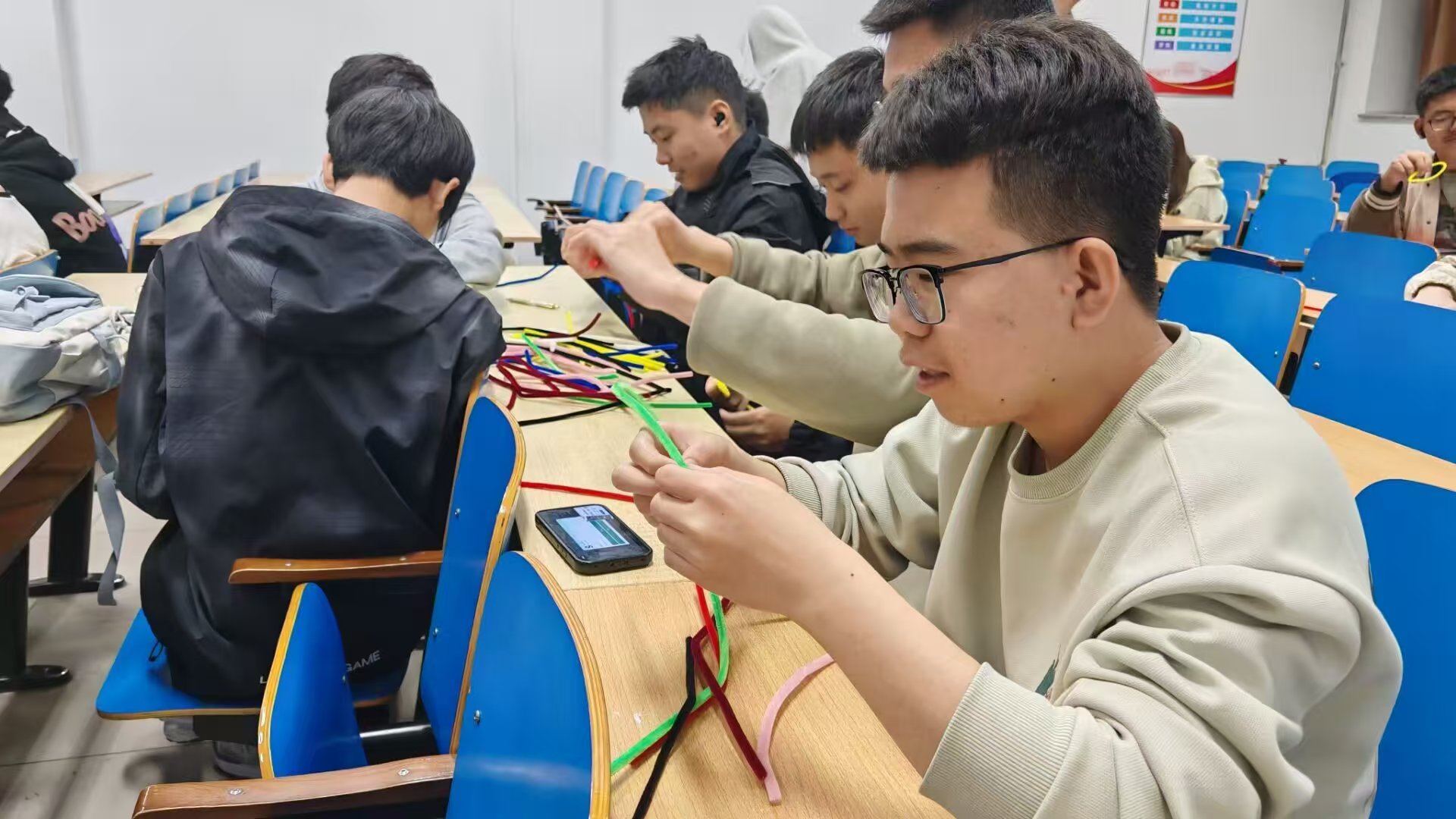 分發完色彩豐富的扭扭棒和輔助工具后,同學們迅速組隊,分工協作。有人負責設計草圖,有人專注扭折塑形,有人精心搭配顏色。纖細的扭扭棒在指尖翻轉、纏繞、彎折,不一會兒,一個個造型獨特的安全標識雛形便逐漸顯現。編織過程中,歡聲笑語不斷,大家在動手實踐中加深了對安全知識的理解,也增進了彼此間的默契與情誼。