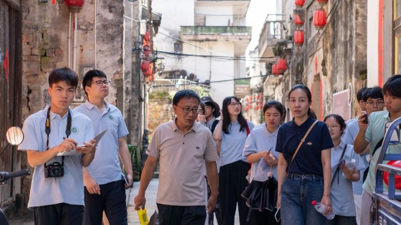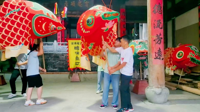 團隊深入調研,探尋千年魚燈文脈。在瞻淇村,師生們通過當地團縣委、村負責人及汪文華老書記的引導,了解了古村1300余年歷史,特別是魚燈自南宋起源、蘊含“水肥魚躍、子孫秀美”祈愿的文化內涵。在敦睦堂,老書記講解了魚燈作為“活態史詩”的節慶習俗與生活哲學。隊員們還走訪非遺傳承人鄭冬蛟、汪師傅,詳細記錄魚燈從起源到當代的傳承脈絡,學習其工藝革新及美好寓意,并親身體驗魚燈制作與舞動。