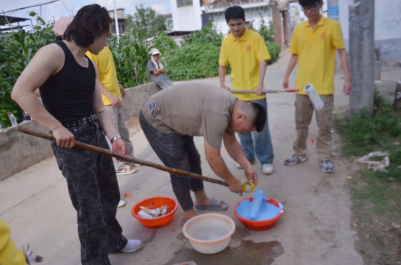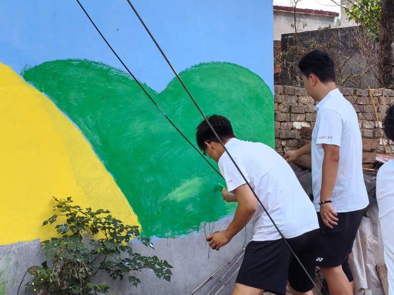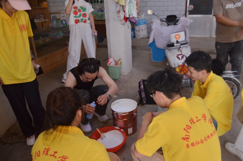 圖為實踐隊員在整理墻面,制作粉刷工具