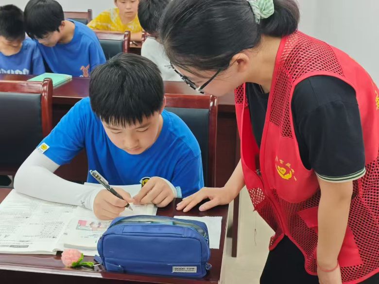 實踐隊以“課業(yè)輔導(dǎo) + 多彩課堂”模式,為低齡學(xué)生打造暑期學(xué)習(xí)樂園。課業(yè)輔導(dǎo)中,隊員化身“小老師”,針對不同年級、學(xué)科的知識難點,開展“一對一”或“小組式”輔導(dǎo)。摒棄填鴨式教學(xué),用啟發(fā)式引導(dǎo)讓知識鮮活:把古詩詞編成故事,將數(shù)學(xué)難題轉(zhuǎn)化為生活實例。原本頭疼寫作的初一學(xué)生,都興奮感慨“寫作文像講故事一樣好玩” ,孩子們緊鎖的眉頭舒展,求知欲被點燃。