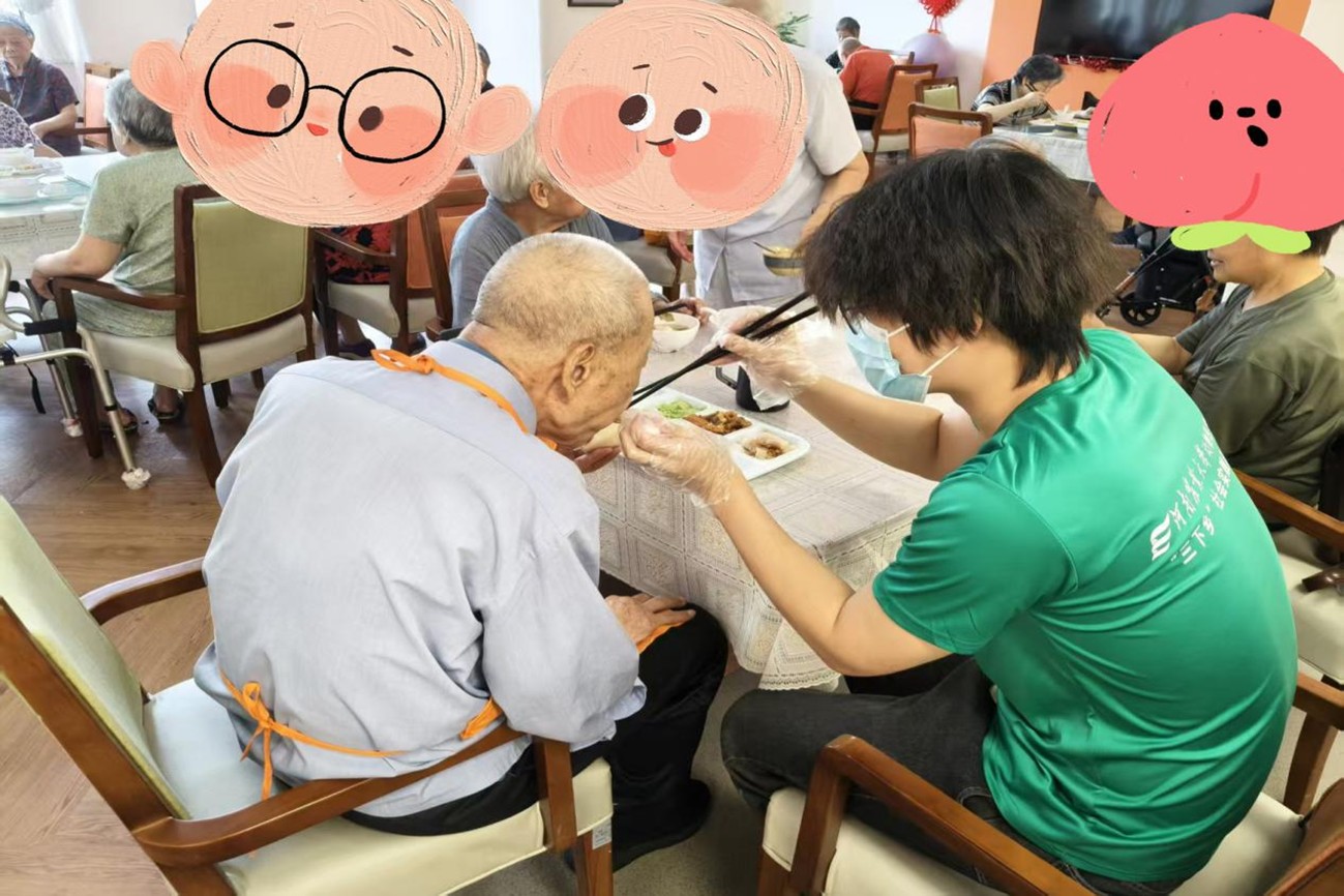 臨近中午,二樓的同學們主動承擔起為老人打飯盛湯的工作,將熱騰騰的飯菜送到每一位老人手中。對于行動不便的老人,同學們更是耐心地一勺一勺喂食,展現出無微不至的關懷。與此同時,一樓的同學積極協助養老院食堂賣飯,維持秩序,確保社區居民能夠順利就餐。飯后,他們又馬不停蹄地收拾餐桌、打掃衛生,將食堂清理得干干凈凈,為社區居民營造了一個整潔舒適的用餐環境。