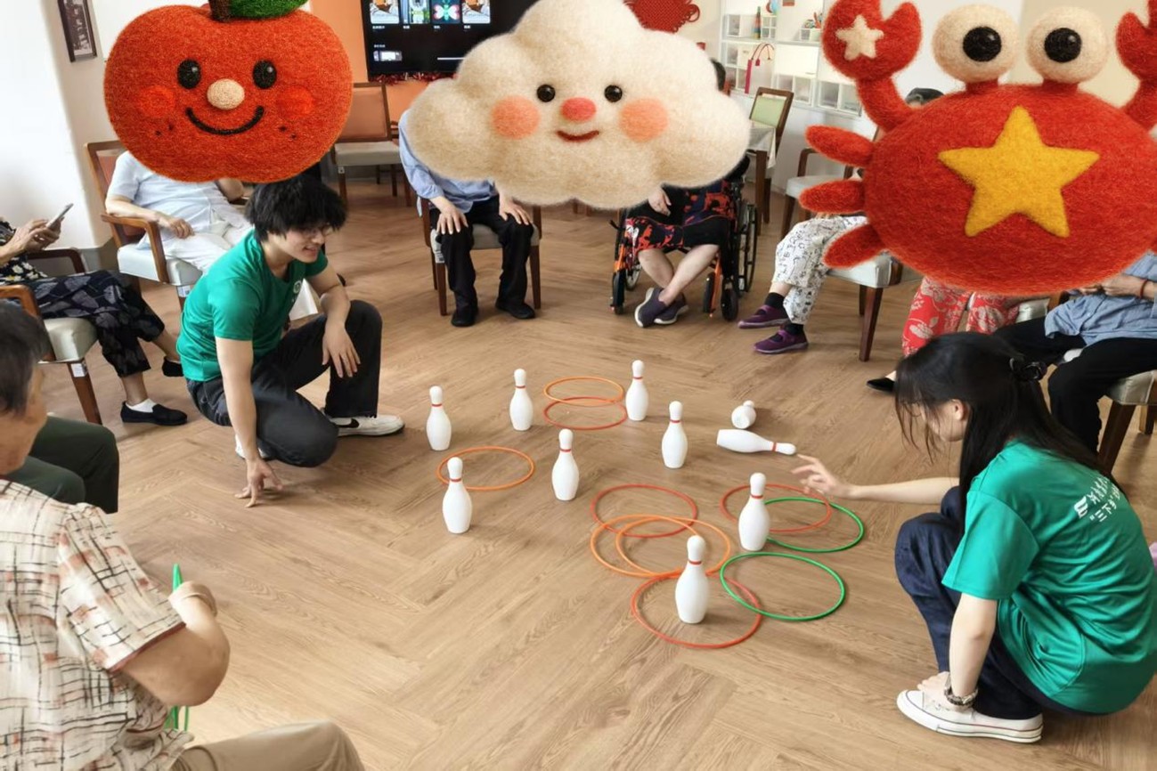 拍拍操結束后,部分精力充沛的老人留下來進行套圈游戲。志愿者們布置游戲場地,擺放物品,教授老人們套圈,游戲現場熱鬧非凡,老人們全神貫注,小心翼翼地投擲套圈,每當成功套中目標,都會響起陣陣歡呼與掌聲。隨后,大家又圍坐在一起唱歌,從經典老歌到紅歌,歌聲在大廳里回蕩,新老兩代人用歌聲傳遞溫情,每個人都沉浸在歡樂的氛圍中。老人們用歌聲訴說著往昔的故事,志愿者們則用歌聲傳遞著對老人們的祝福。