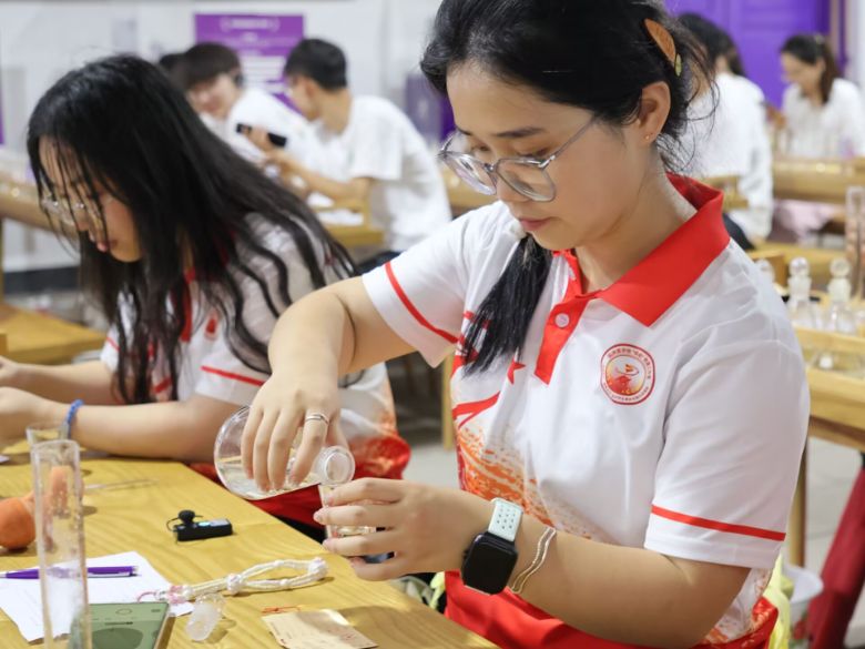 在勾調體驗室,實踐隊員們迎來了核心的動手環節化身“調酒師”,首先進行聞香品鑒,專注辨別七個輪次基酒的風味譜系:從一輪次的“清新果香”逐漸遞進到七輪次的“醇厚焦香”,境界漸深,層次分明。隨后,在講解老師的指導下親手調制,按照建議比例精心混合不同輪次基酒。這一過程不僅是對味蕾的挑戰,更讓青年學子們親身體驗了“或甘或苦皆自釀”的釀造哲理,感悟匠心與人生的微妙關聯。