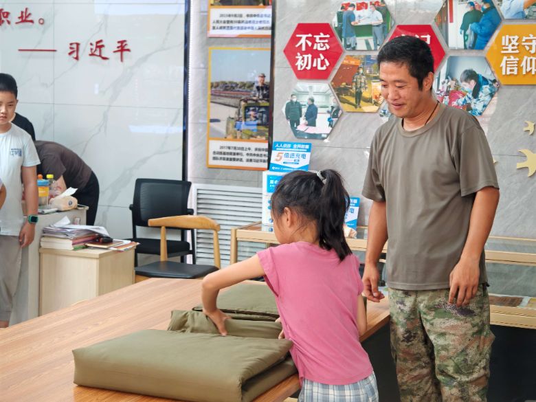 理論學(xué)習(xí)之后,動手實踐環(huán)節(jié)緊隨而來。退役軍人的嚴(yán)謹(jǐn)作風(fēng)如何體現(xiàn)?一場別開生面的“疊豆腐塊”被子教學(xué)給出了答案。在退役軍人代表的耐心示范下,“方正、有棱角”的規(guī)范要求被一一拆解。孩子們青澀的手指撫平褶皺、修整邊角,在老兵手把手指導(dǎo)下反復(fù)嘗試?此坪唵蔚膬(nèi)務(wù)整理,讓 “一絲不茍” 的軍人品格悄然植根童心。