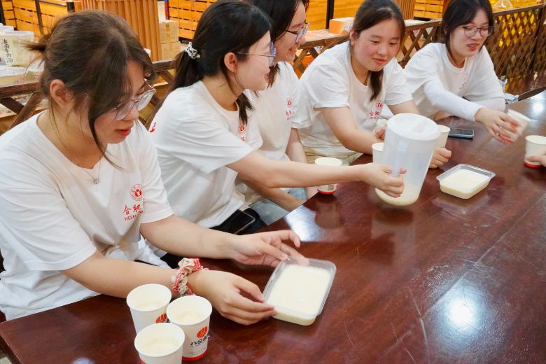 隨后,團隊成員來到豆腐主題文化園。在工作人員的講解下,一場關于豆腐文化的千年畫卷就此展開。從劉安煉丹誤發明豆腐的古老傳說,到豆腐制作技藝在歷史長河中的演進,成員們穿梭于千年時光,窺見豆腐文化不斷發揚的蛻變。這一過程中,他們不僅聆聽了引人入勝的故事,還目睹了傳統工藝的精妙,更體悟到豆腐在中國文化版圖中的重要性。而當他們走進互動體驗區,親手磨豆漿、點豆腐,看著白嫩的豆腐漸漸成型,內心對豆腐文化的熱愛也在這一瞬間被點燃。