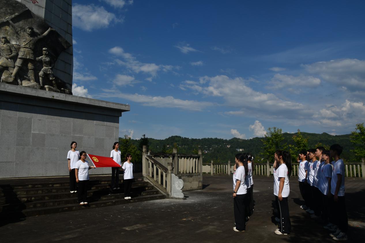 參觀結束后,志愿服務團的成員們懷著崇敬之心,徒步二十分鐘登上南腰界紅軍紀念塔所在地。在巍峨的“紅二、紅六軍團會師紀念塔”前,志愿服務團全體黨員、預備黨員列隊肅立,面向黨旗重溫入黨誓詞,全體團員面向團旗莊嚴宣誓。鏗鏘有力的誓言在山間回蕩,紅色的血液在體內流淌,這是新時代青年繼承先烈遺志、勇擔時代使命的堅定決心。