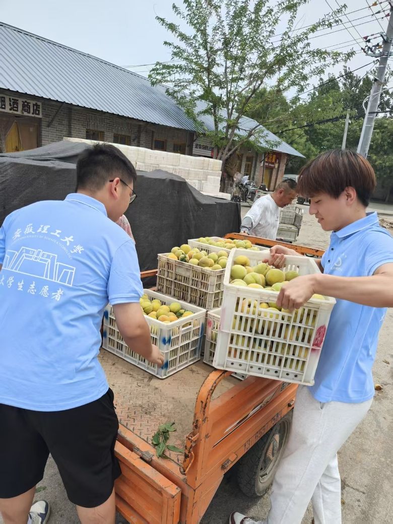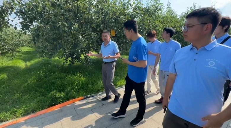 午后的陽光漸烈,實踐隊來到一片梨園,幫著梨農阿姨卸車裝貨。阿姨一邊麻利地操作,一邊和同學們拉起家常。談及農產品銷售,他黝黑的臉上露出復雜的神情:“酥梨收成好的時候愁賣,價錢好了又怕減產。”同學們一邊幫著卸車,一邊認真記錄著老人的困惑。隨后,實踐隊來到了碭山著名的“百年梨樹王”下。這棵歷經百年風雨的老梨樹,樹干粗壯得需數人合抱,枝椏遒勁地伸向天空,枝頭仍掛滿了青澀的果實,以明末的年齡和年產量達4000斤被稱為梨樹王。訴說著碭山從黃河泛濫的荒灘到萬畝梨園的變遷,也見證了黨帶領群眾脫貧致富的歷程。撫摸著粗糙的樹皮,同學們仿佛觸摸到了這片土地的脈搏,更深刻地理解了“鄉村振興”四個字的千鈞分量。