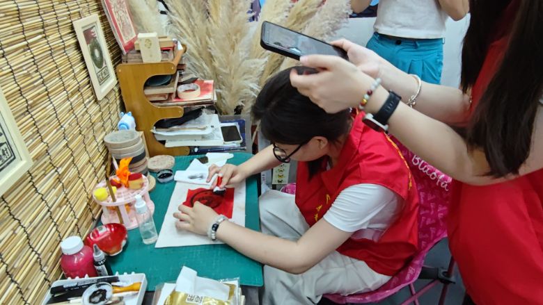 最后,實踐小分隊在邯鄲道非遺工坊體驗傳統拓印技藝,創新開設“非遺技藝云體驗”直播。活動中,團隊完整記錄了從選紙、研墨到捶拓、揭片的全流程工藝細節,邀請非遺傳承人現場示范關鍵技法。直播通過鏡頭特寫與工藝解說結合,生動呈現拓印技藝的“復形傳神”之妙,獲贊5000余次,彈幕互動中“非遺之美藏在細節”“想親手體驗”等留言頻現。活動既延續了拓印技藝“以紙載史、以墨傳文”的文化功能,又通過云端傳播打破地域限制,探索非遺活態傳承新路徑。這讓團隊成員更加堅信,新媒體傳播是推動非遺"活態傳承"的有效途徑,也是實現傳統文化創造性轉化、創新性發展的重要抓手。