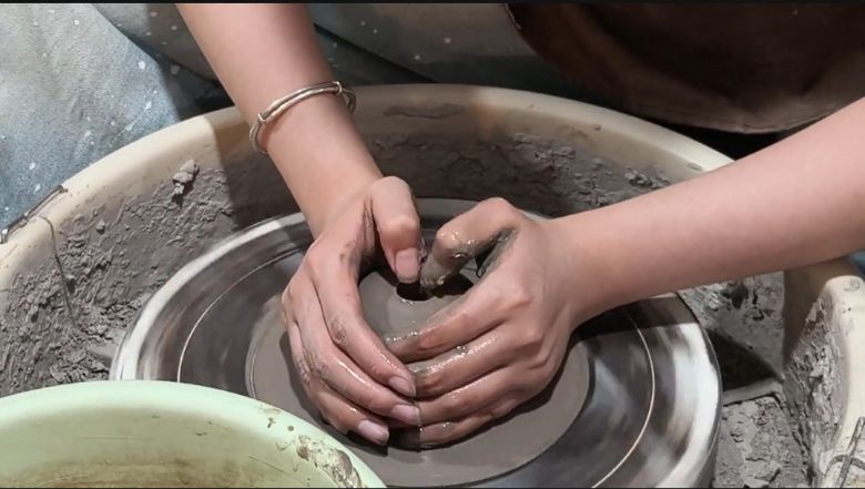 第二站,實踐小分隊來到峰峰礦區異品坊,近距離觀摩并體驗當代匠人的制陶技藝。團隊成員深度參與制瓷全流程,分析胎土配比、釉料成分的科學性,探究傳統配方與現代材料的融合可能;在匠人指導下完成拉坯、刻花工序,感受“手隨泥走,心與器合”的工匠精神;在制陶過程中切實體會非遺文化在當代的創造性轉化與發展潛力。