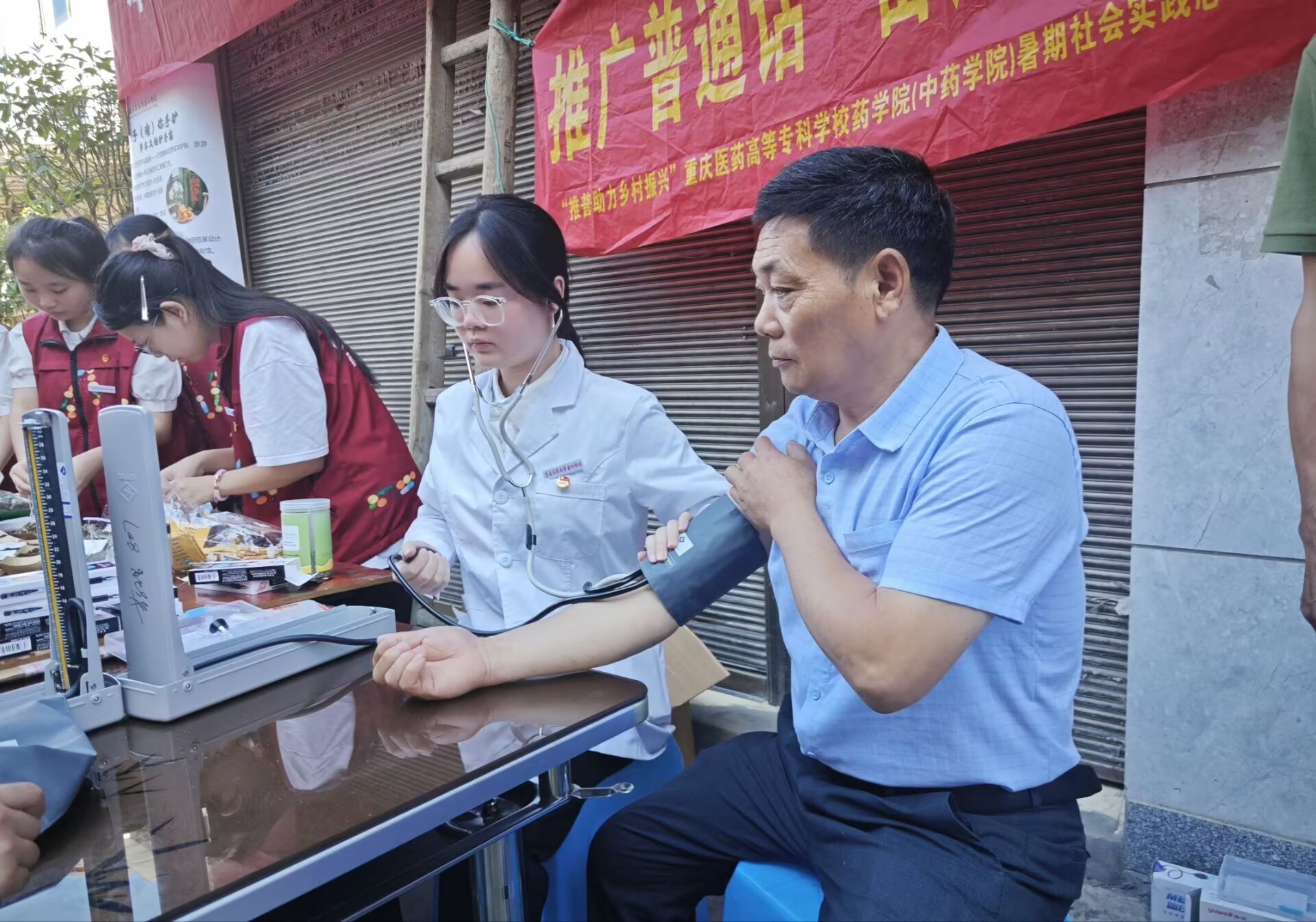 圖為服務(wù)隊(duì)隊(duì)員為當(dāng)?shù)鼐用襁M(jìn)行血壓測量。李興宇 供圖