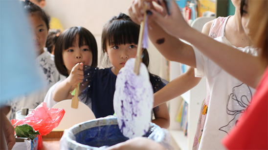 “一葉一扇,匠心相傳”。隨后的非遺體驗環節將活動推向高潮。手工拓印時,教室里“叮叮咚咚”的敲打聲此起彼伏。孩子們手中的小錘,不僅是拓印紋樣的工具,更如清脆的鐘磬,叩響了感知美、創造美的大門。制作漆扇時,他們興奮地簇擁在志愿者身邊,眼神專注,屏息凝神,沉醉于傳統技藝的魅力之中。小小的漆扇,盛滿了童真想象與非遺智慧的碰撞交融。小朋友們的童心意趣匯集成一個小型展覽,受到了家長們的喜愛和一致好評。