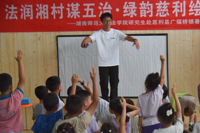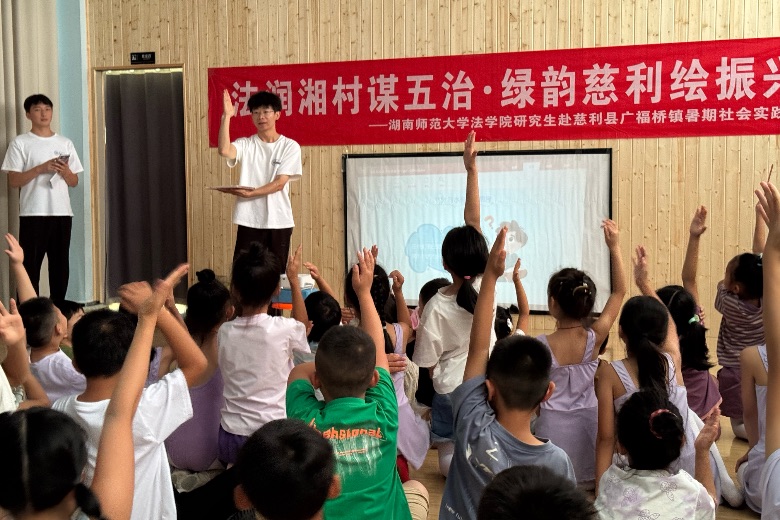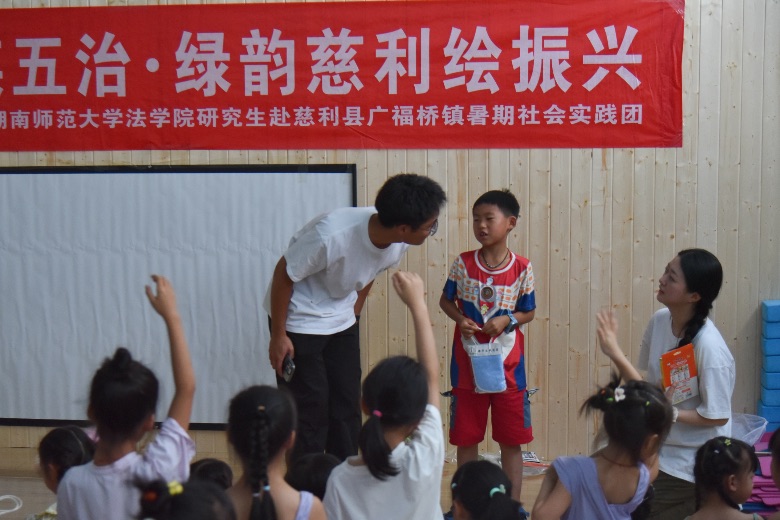 為深入貫徹習近平法治思想,加強未成年人法治教育和生態保護意識,構建“家庭-學校-社會”協同育人體系,7月9日,湖南師范大學法學院研究生暑期實踐團在廣福橋鎮人民政府的支持下,聯合鎮團委與部分在慈利選調生代表,在廣福橋鎮開展“七彩假期·法育青苗”未成年人雙主題普法課堂活動,通過“知識+互動”的形式,為現場50余兒童打造了一個寓教于樂的法治教育課堂。
