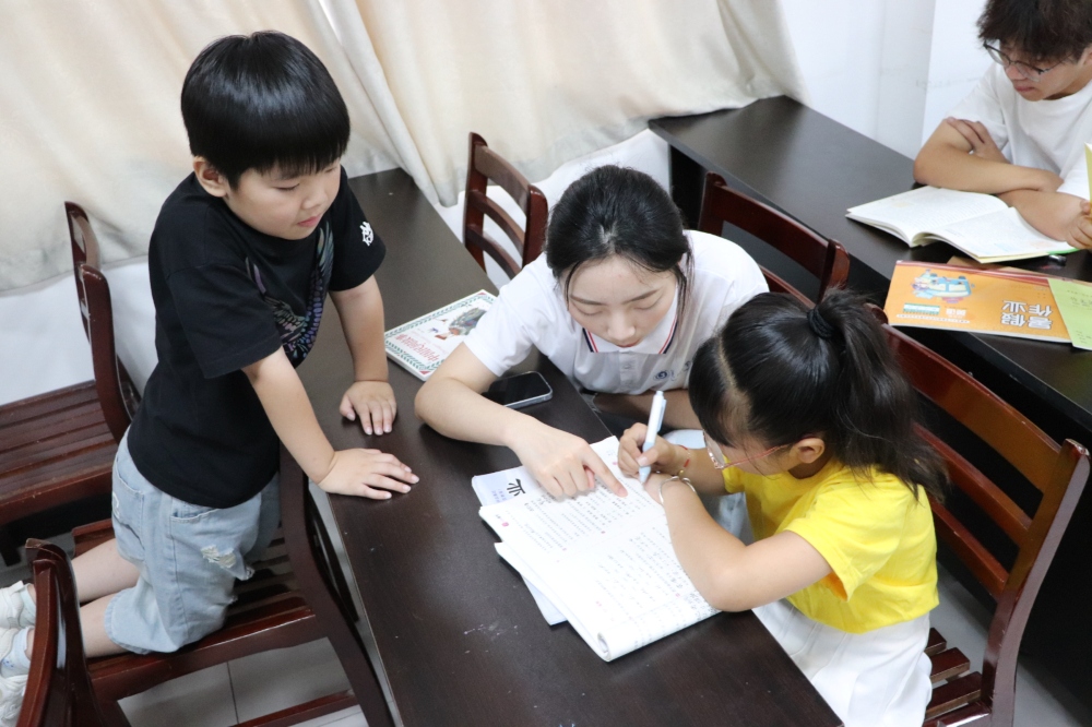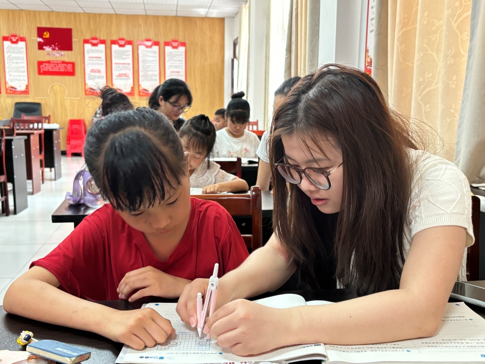 圖為志愿者在幫助小朋友解決課本上的難題。方琛攝