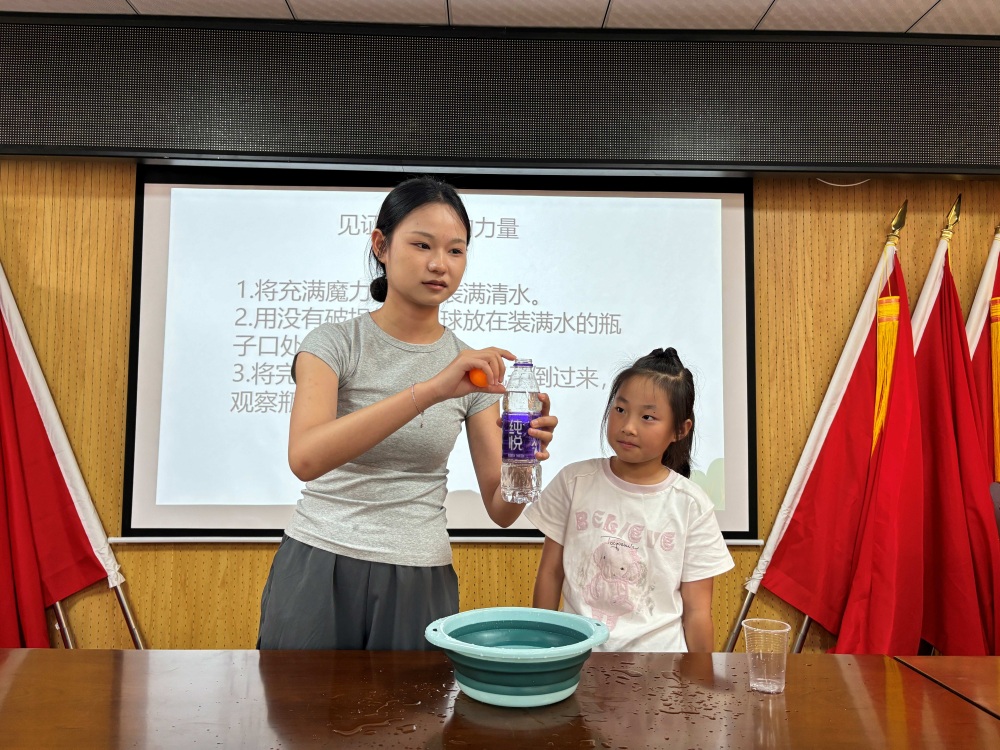 圖為志愿者為小朋友講解實驗失敗的原因,并積極引導小朋友完成實驗。張慧攝