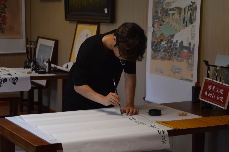 圖為支教隊隊長韓增瑞體驗書法項目。 李健哲 供圖