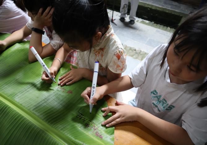 在實踐站內,團隊成員圍繞防溺水等安全教育開展“安全小衛士”競答環節,孩子們舉著小手搶答“抽筋要冷靜”、“游泳前要熱身”,實用知識入腦入心;戲曲臉譜工作坊內,孩子們繪制關羽、包拯等經典臉譜,童趣作品在指尖綻放;孩子們還用深綠芭蕉葉作“心愿紙”,寫上“長大當軍人保衛祖國”等純真話語。全程投入的孩子們在紅色浸潤、安全競答、藝術創作中,收獲信仰溫度、自護智慧與理想力量,這場寓教于樂的實踐正為鄉村兒童成長注入鮮活動能。