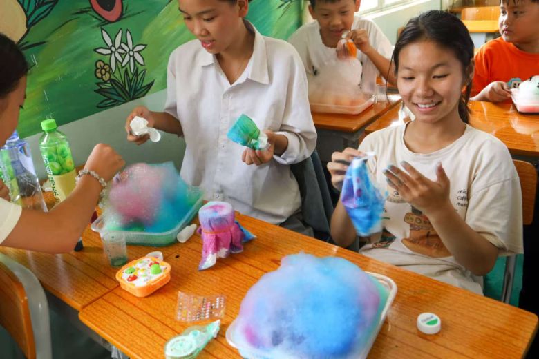 11日下午,“科學趣味課堂”迎來高潮環節——“火山噴發”模擬實驗。作為“守護含羞草”計劃中“求知啟蒙”板塊的關鍵實踐,志愿者利用小蘇打、白醋和食用色素等常見物品,將抽象的酸堿中和原理轉化為直觀震撼的視覺現象。當模擬的彩色“巖漿”從自制“火山”模型中噴涌而出時,現場爆發出陣陣驚嘆,極大地激發了鄉村學生的好奇心與探索欲。