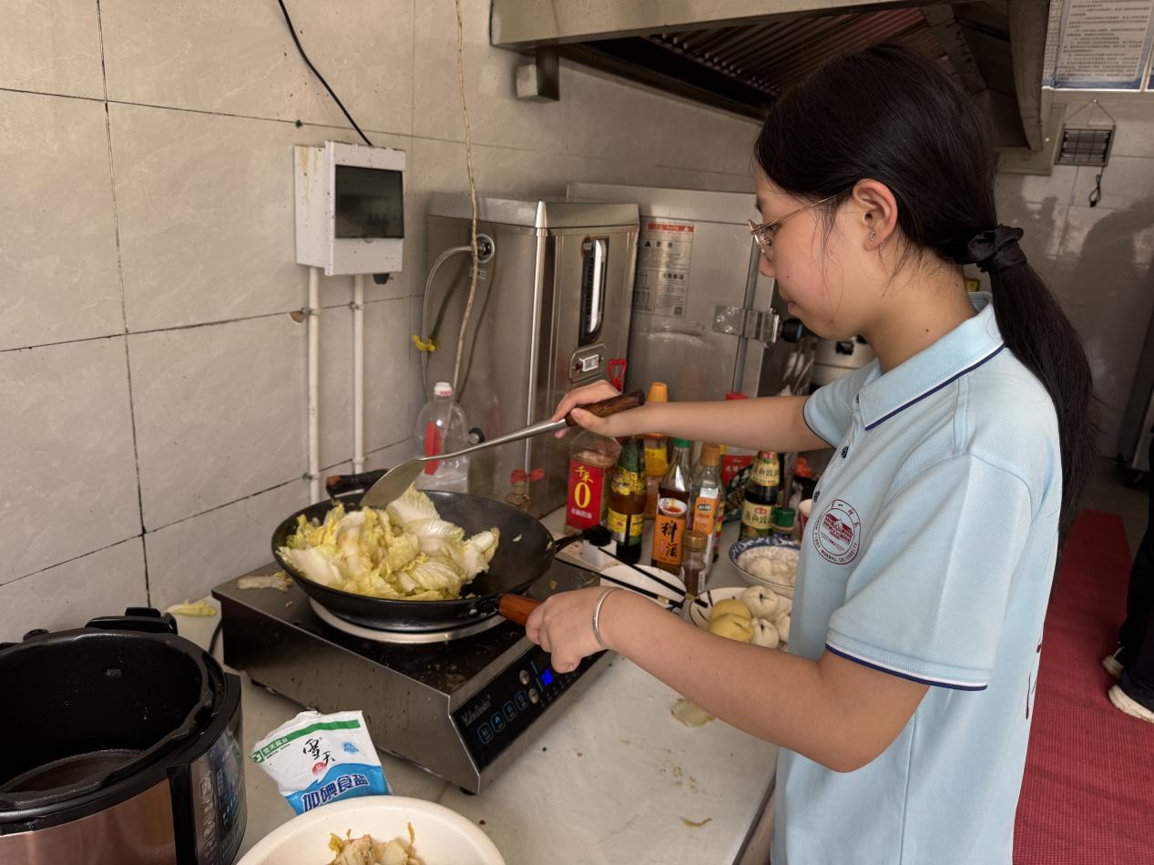 廚房里,“主廚三人組”的忙碌勁兒剛過(guò)。洗米、打蛋、切菜,動(dòng)作雖不算嫻熟,卻透著十足的認(rèn)真。蛋炒飯要炒得粒粒分明、裹滿(mǎn)金黃蛋液,炒白菜得保持翠綠爽脆,紫菜蛋湯要熬出鮮美的底味,酒釀小圓子得煮得軟糯不粘,金錢(qián)蛋更是要炸得外焦里嫩、調(diào)味均勻。一番鍋碗瓢盆的“交響曲”后,五道菜陸續(xù)上桌,熱氣騰騰間,香氣直往人鼻尖鉆。