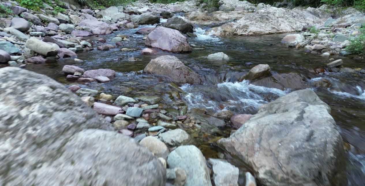 (圖為無人機拍攝的稻田) 隨后,團隊的探索延伸至村旁蜿蜒流淌的清澈溪流。無人機沿著潺潺流水低空掠過,高清鏡頭細致刻畫出溪水晶瑩剔透的質地、岸邊形態各異的山石與茂密蔥郁的植被。水波蕩漾間,魚群游弋,孩童戲水的歡笑聲隱約可聞,這方滋養會溪村的水系所蘊含的靈動生態之美與淳樸生活氣息,在航拍視角下得以全景式生動呈現。