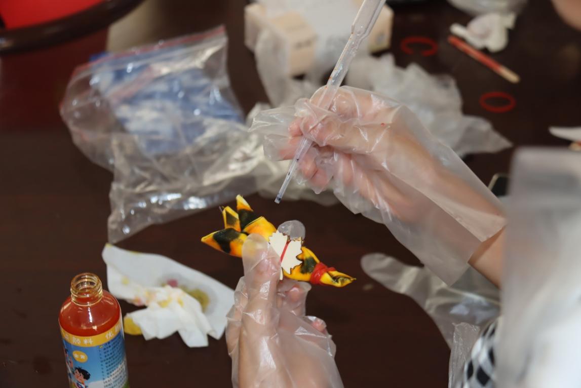理論結合實踐,體驗非遺魅力。在扎實的理論鋪墊后,梅子婧重點演示了扎染的核心技法。她親手示范了“捆扎法”——指導孩子們?nèi)绾瓮ㄟ^折疊、撮皺、捆扎棉線或麻繩,在棉布上創(chuàng)造出千變?nèi)f化的圖案肌理;接著展示了“夾扎法”,利用不同形狀的木板、竹片對折疊好的織物進行夾持固定,形成清晰的幾何防染區(qū)域。在講解“浸染法”和“噴染法”時,她強調(diào)了操作的安全性與染色的均勻性,并鼓勵孩子們大膽嘗試。