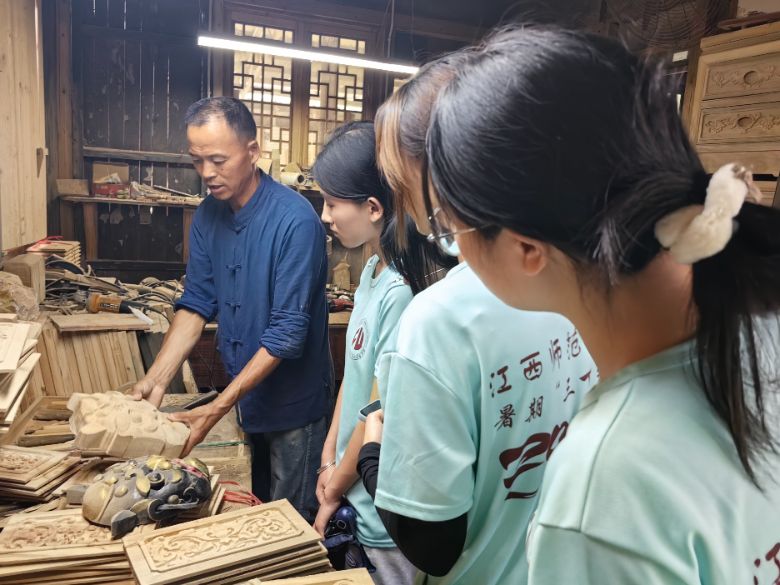 7月8日,為深入了解非物質文化遺產(chǎn)的保護與傳承現(xiàn)狀,江西師范大學外國語學院“鄉(xiāng)村振興青藜鄉(xiāng)探團”暑期三下鄉(xiāng)實踐團隊走進三雕傳承人洪廣德師傅的工作室,深入探訪儺面雕刻技藝,聆聽這位木雕大師的匠心故事,感受非遺文化的深厚底蘊與時代創(chuàng)新。