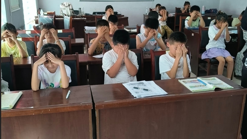 眼保健操時間,隊員們化身 “護眼小衛士”。他們將標準動作視頻投放到大屏幕上,逐個糾正學生的姿勢:“中指要放在太陽穴上”“不要用手壓眼球”。對于動作不標準的學生,隊員們蹲下身來手把手教學,直到他們掌握正確方法。“老師說這樣做眼睛會更亮,以后能看清楚遠處的黃河。” 四年級學生姜子沫認真地說,小手跟著音樂節奏一絲不茍地按揉穴位。