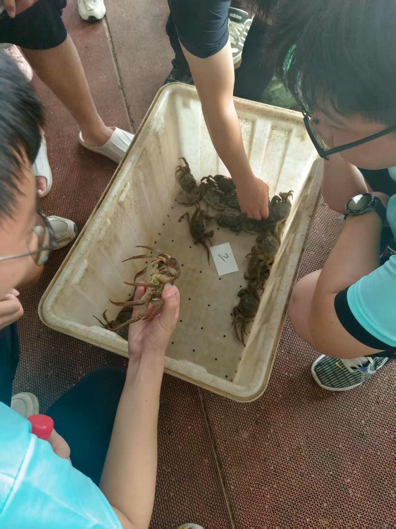 會(huì)議結(jié)束的鈴聲仿佛成了實(shí)地考察的 “發(fā)令槍”,同學(xué)們迫不及待地來(lái)到實(shí)驗(yàn)站后方的蟹塘區(qū)域。眼前的塘口被整齊劃分成成蟹區(qū)與幼蟹區(qū),水面上漂浮的增氧機(jī)正規(guī)律地?cái)噭?dòng)著水波。負(fù)責(zé)蟹塘管理的研究生們手持撈網(wǎng),一邊示范一邊講解:“成蟹塘的投喂要注重蛋白質(zhì)比例,每天早晚各一次;幼蟹則需要更精細(xì)的飼料配比,還要注意防止同類相殘。” 同學(xué)們圍在塘邊,時(shí)而俯身觀察水底的蟹穴,時(shí)而記錄研究生提到的關(guān)鍵數(shù)據(jù),針對(duì) “如何控制幼蟹成活率”“成蟹性成熟的判斷標(biāo)準(zhǔn)” 等問(wèn)題展開(kāi)熱烈提問(wèn),原本安靜的塘埂變成了生動(dòng)的 “戶外課堂”。