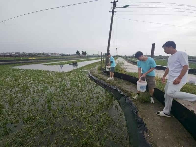 離開(kāi)金水源公司,團(tuán)隊(duì)來(lái)到騰飛蟹業(yè)的養(yǎng)殖基地。這里的水塘與稻田相連,構(gòu)成了 “蝦稻蝦”“蝦稻蟹” 的立體養(yǎng)殖圖景。工作人員指著塘邊的標(biāo)牌介紹:“這一片是公蟹塘,那一片是母蟹塘。公蟹長(zhǎng)得快,作為六月黃提前上市;母蟹則慢慢養(yǎng),到中秋、國(guó)慶時(shí)長(zhǎng)成肥美的大閘蟹,正好趕上消費(fèi)旺季。” 在水塘邊的監(jiān)測(cè)室里,屏幕上實(shí)時(shí)顯示著水溫、pH 值、溶氧量等數(shù)據(jù)。“治水就是養(yǎng)蟹的命根子,尤其是溶氧量,低于 5 毫克 / 升蟹就會(huì)缺氧。” 工作人員指著一臺(tái)正在運(yùn)轉(zhuǎn)的增氧機(jī)說(shuō),“現(xiàn)在高溫天,我們每 3-5 天就要用生物制劑改底,投點(diǎn)光合菌調(diào)節(jié)水質(zhì),水草要占一半多的水面,再放些田螺,既能幫著清淤,又是螃蟹的天然餌料。”同學(xué)們對(duì)養(yǎng)蟹的高要求若有所思。