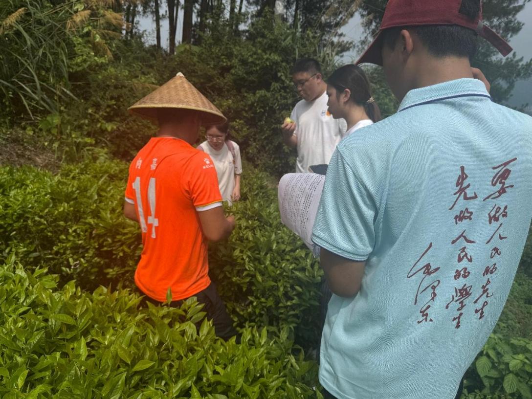7月10日,團隊成員探訪了會溪村的“種茶大戶”向云權。向云權是一位有著二十多年種茶經驗的老黨員,他帶領大家來到茶壟間,向團隊成員們傳授采茶技巧,分享種茶心得。他樸實的話語中透露出對土地的熱愛和對品質的堅守。團隊成員們詳細詢問了古丈毛尖的種植周期、采摘標準和銷售渠道,并認真記錄下向云權的期盼:“希望國家能多為茶農提供技術幫扶,讓好茶更有出路。”