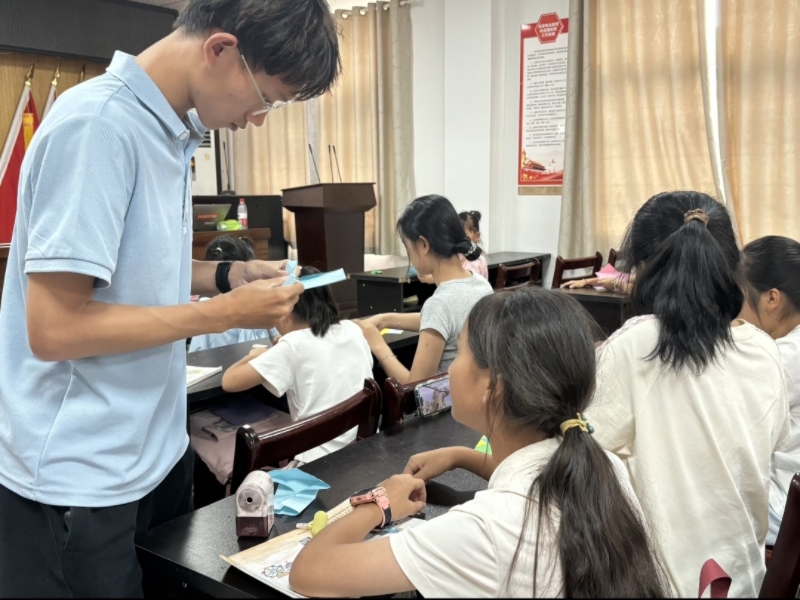 手工制作課程,是一場用雙手創造美好的奇妙之旅。隊員們帶著彩紙、剪刀、膠水等簡單材料,和孩子們一起折四葉草、蝴蝶、用扭扭棒做四葉草掛件。過程中,沒有固定的“標準答案”,孩子們可以盡情發揮想象,用稚嫩的小手將普通材料變成獨一無二的作品。這門課程不只是教孩子們制作技巧,更在引導他們發現美、創造美,讓每一份用心打磨的作品,都成為這個夏天里溫暖而珍貴的記憶。