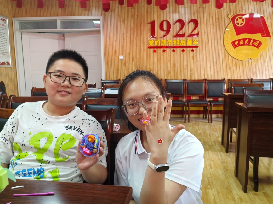視頻演示剛落,志愿者們便俯身靠近,身影與孩子們的好奇交疊。有的拈起彩泥示范,指尖旋轉出細胞膜的柔弧,像為微觀世界圈定溫柔邊界;有的輕握孩子的手,共塑細胞核的渾圓,掌心相觸間傳遞著塑形的巧思;還有的蹲在桌旁,細引著搓出內質網的蜿蜒,捏出葉綠體的紋路,每一步都似在微觀宇宙里鋪展路徑。不多時,指尖生趣,一個個造型鮮活、細節分明的細胞模型漸次成型。孩子們舉著親手捏就的作品,左瞧右看,眉眼間漾著滿滿的歡喜,仿佛托著一整個觸手可及的微觀星河。