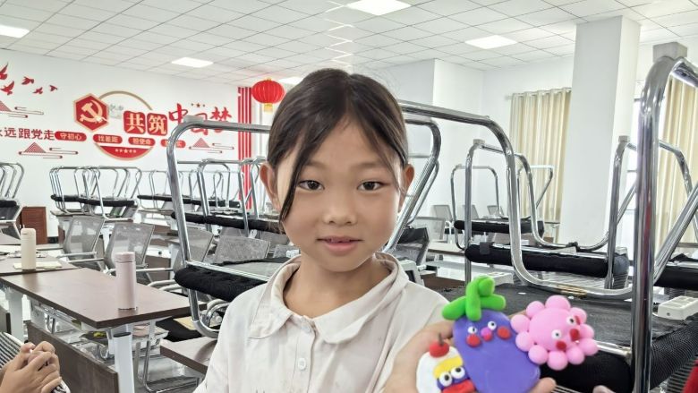 折紙結束后,橡皮泥小章魚創作緊接著展開。隊員們拿出紅、黃、藍等各色橡皮泥,先示范揉出圓滾滾的身體,再用小鑷子夾出八條彎彎的“觸手”,最后用黑泥點上圓眼睛。“大家可以給章魚加個笑臉,或者讓觸手卷起來,就像在水里游一樣!”在隊員的鼓勵下,孩子們發揮想象:有的給章魚捏了花紋,有的讓幾只小章魚“手拉手”,還有的給章魚“戴”上了用彩紙做的小帽子。看著自己捏出的呆萌小章魚,孩子們成就感滿滿,舉著作品互相展示。