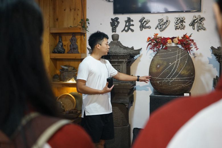 聆聽歷史回響,探尋黑砂深蘊。步入場館,余學銘先是細致介紹“砂韻”、“癩寶壺”等黑砂珍品,其工藝之精令人稱絕;繼而從原料甄選、黑砂特質、核心技藝等方面系統闡釋非遺黑砂的獨特地位與珍貴價值。移步燒制區,隊員觀摩古樸的“饅頭窯”,深入探秘素坯入窯的單一色澤,到出窯時砂器萬般萬彩的奇妙窯變過程,領略“滎經三彩”的絢爛魅力。“作為年輕一代非遺傳承人,我們積極創新制作工藝,并通過線上直播讓更多人見證黑砂之美。”余學銘講解道。此外,他們更以“非遺互融”的巧思,將榫卯等古老技藝融入黑砂創作,讓不同非遺在碰撞中綻放異彩,奏響非遺美美與共、互促共榮的美妙樂章。