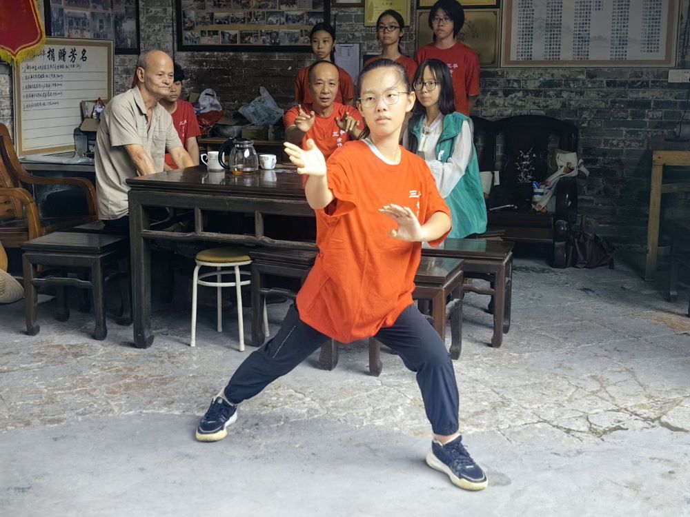 “徐師傅,您能給我們展示一下醒獅武術嗎?”采訪中,Young實踐團與武館教練徐新晃師傅及學員們圍坐在一起,邊做筆錄邊交談。談到醒獅技藝,徐新晃師傅立刻站起身來,邊展示邊講解,講到興致處,特意亮了幾招蔡李佛拳,其步法靈活穩健,剛中帶柔。實踐團成員們紛紛按下快門,記錄這一精彩瞬間。