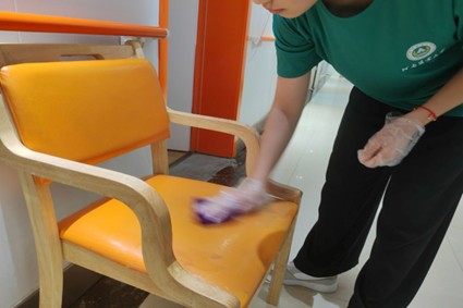 移步休息區,另一番認真的圖景展開。志愿者微微俯身,透明手套貼合著手部,紫色抹布在橙色座椅上輕柔游走。她順著座椅紋理擦拭,遇到污漬,便放慢動作,反復輕抹,像是在雕琢一件珍貴器物。每一下擦拭,都帶著讓老人坐得舒適、看得舒心的期許。這一方座椅,承載的將不只是老人休憩的身體,更是志愿者們用心營造的溫馨角落,讓老人能安心在此曬太陽、話家常。