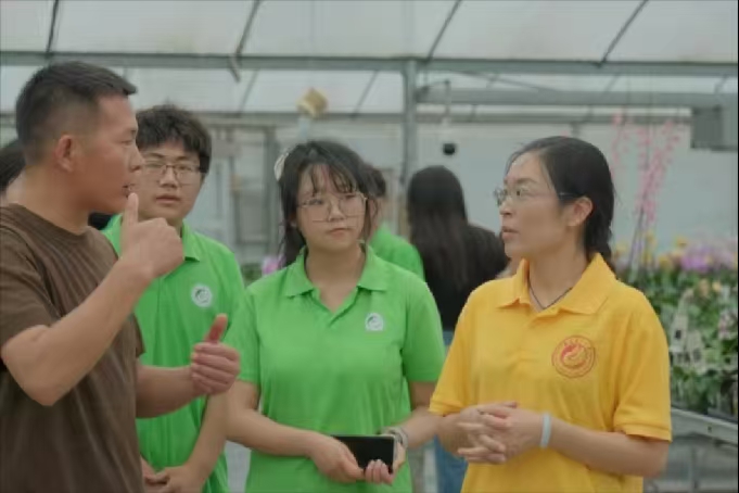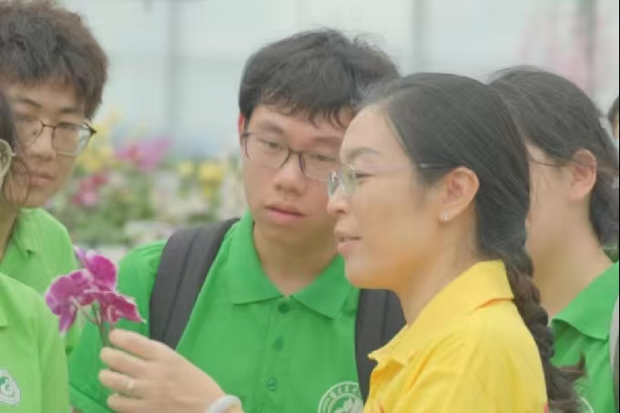 隨后,實踐隊參觀了中心蘭園及蝴蝶蘭種植園。蘭園兼具休憩與科教展示功能,種植有蝴蝶蘭、石斛蘭、文心蘭等品種;種植園保存了上千種蝴蝶蘭種質資源,為品種研發和市場調控奠定基礎。實踐隊了解到,相較于種莢繁殖,蘭花組織培養技術能更穩定保留植株性狀,便于大規模推廣。秦源教授向隊員講解了蝴蝶蘭的兼性CAM(景天酸代謝)耐旱特性,鄭平副教授則結合實踐內容,引導隊員認識種質資源保護與利用的重要性。