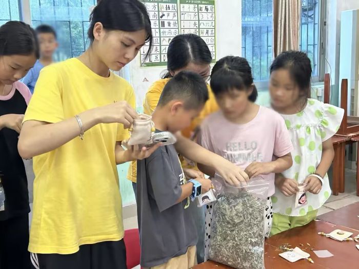 圖二“半夏鹿鳴”實踐隊在愛和水晶寶貝親子園教家長們功夫扇(2)香囊里的夏意:把自然的芬芳縫進時光