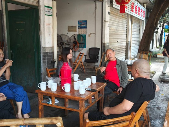 圖五:小倪同學(xué)認真聽著李叔回憶當年服務(wù)基層的經(jīng)歷