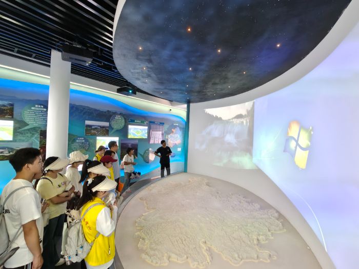 貴州三江堰水生態(tài)保護宣教基地,作為省內(nèi)首個專注于水生態(tài)保護宣傳和節(jié)水教育的省級水生態(tài)文明宣傳教育中心,重點推廣和普及水生態(tài)保護以及節(jié)約用水的重要性。該基地運用了戶外導(dǎo)視、交互裝置、藝術(shù)雕塑以及聲、光、電、影等多種現(xiàn)代展陳技術(shù),全面而立體地展示了貴州省水情、水生態(tài)治理、保護和節(jié)約用水的顯著成效。