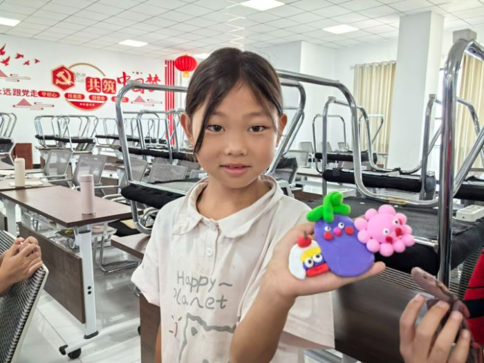 上午十時許,社區活動中心里暖意融融,手工創意課堂正式拉開帷幕。實踐隊員們將精心準備的超輕粘土分發給孩子們,按照年齡特點合理編組,7個小組的孩子們圍坐在一起,眼中閃爍著期待的光芒。隊員們先是示范了揉、捏、塑形等基礎技法,隨后便鼓勵孩子們解放想象力,用指尖的創意勾勒心中的世界。 有的小組合力創作“民族團結小院”,用五彩粘土捏出載歌載舞的各族小朋友;有的小組專注還原“鄉村新貌”,土黃色的屋頂、藍色的光伏板,細節中透著對家鄉發展的觀察;還有的孩子別出心裁,將粘土捏成書本、鋼筆的模樣,輕聲說“這是想送給遠方爸媽的禮物”。隊員們巡回指導時,更多是做孩子們創意的“守護者”,當有孩子為“怎樣做出花朵的紋路”犯難時,便蹲下身來一同探索,讓每個奇思妙想都能落地生根。