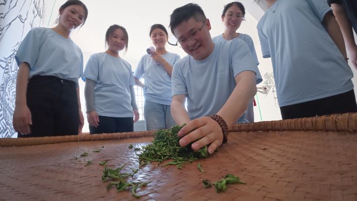 圖為團隊部分成員正體驗揉捻茶葉其余成員一旁學習。黃澤同供圖