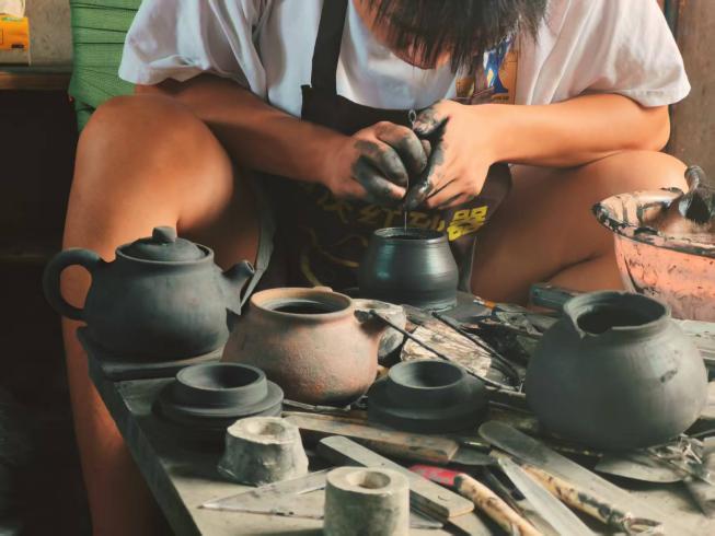 步入制胚區(qū),“白善泥”“觀音土”是滎經(jīng)黑砂的靈魂原料,經(jīng)過風(fēng)吹日曬自然風(fēng)化,帶有著獨(dú)特的黑如漆的光澤。匠人坐在轉(zhuǎn)盤前,手指被泥土染黑,眼神與注意隨著泥胚旋轉(zhuǎn),泥胚在匠人的手指飛舞之下慢慢成型,滎經(jīng)特有的拍打技法,讓胚體線條逐漸流暢而富有力量,胚體更加緊實(shí)。胚體制作完成后將開始簡(jiǎn)單刻花、壓印,讓原本漆黑光滑的胚體由嚴(yán)正肅穆漸漸變得風(fēng)韻雅致。晾胚得在通風(fēng)好的地方,讓水分漸漸散去。最后一步就是裝窯燒制,窯洞中猛火高溫,裝窯這一步要更加小心翼翼,碼放講究,在經(jīng)過相當(dāng)一段時(shí)間的高溫淬煉,完成了從泥胚到黑砂的質(zhì)的轉(zhuǎn)變。