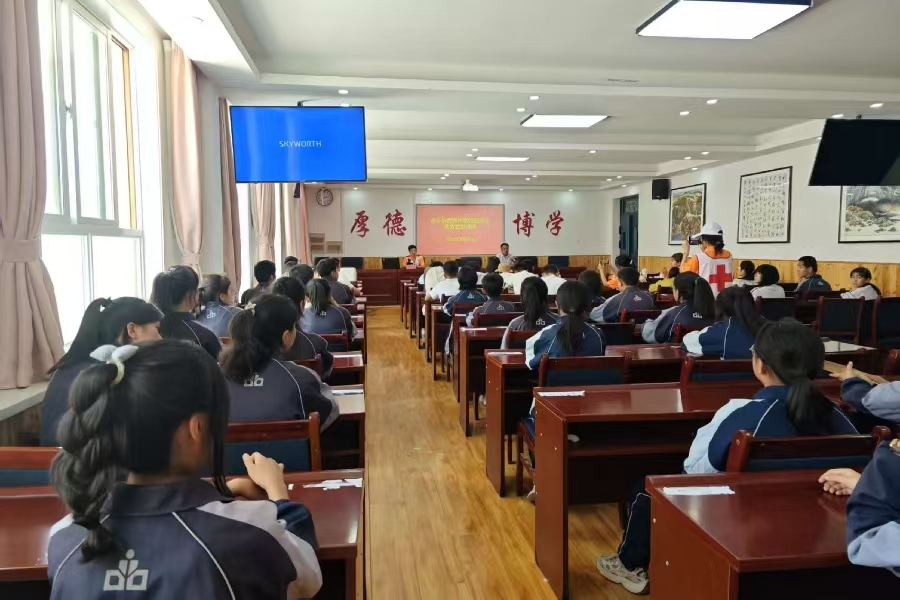 清晨的東鄉民族中學教室座無虛席。在實踐隊邀請下,中國紅十字會郭愛軍老師手持急救包,向百余名學生演示應急技能。“發現同學膝蓋受傷,第一步該做什么?”隨著提問,扎馬尾的女孩主動上臺配合演示。志愿者俯身示范止血包扎,紗布如輕柔羽翼覆蓋傷口模型:“別緊張,就像為傷口蓋上暖被。”
